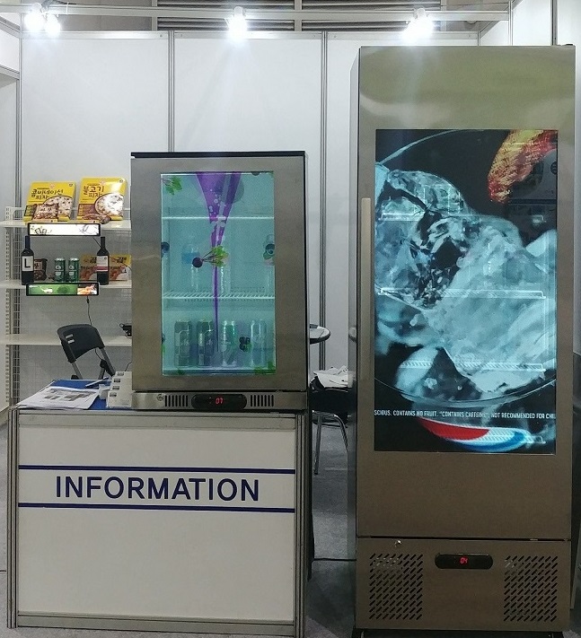 전시회에서 키오스크코리아는 똑똑한 투명 냉장고와 함께 88인치 스트레치 제품을 전시하여 고객들의 이목을 집중하고 있다.