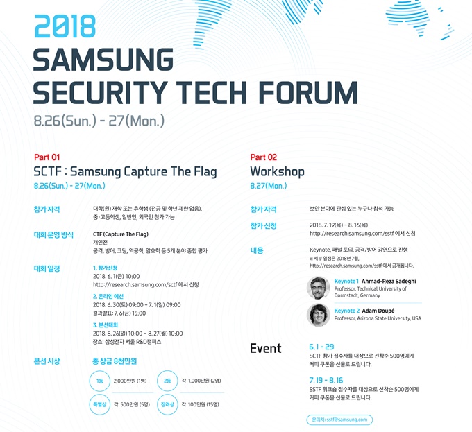 보안기술 포럼(SSTF)은 보안기술 분야의 소프트웨어 저변 확대와 보안에 특화된 우수 인재 발굴을 위해 지난해 처음으로 시작됐다. 보안기술 포럼은 모의해킹 경진대회(Samsung Capture The Flag, SCTF)와 보안기술 워크샵으로 구성된다.