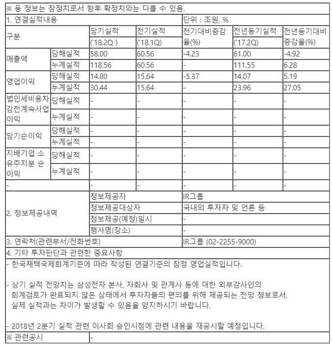 반도체 시장 호황으로 매출 호조가 이어졌던 삼성전자가 2분기 설적 감소를 보였다. 삼성전자는 2018년 2분기 실적이 연결기준으로 매출 58조 원, 영업이익 14조 8000억 원을 달성했다고 발표했다. 2분기 실적의 경우 전기 대비 매출은 4.23%, 영업이익은 5.37% 감소했고, 전년 동기 대비는 매출은 4.92% 감소했고, 영업이익은 5.19% 증가했다.