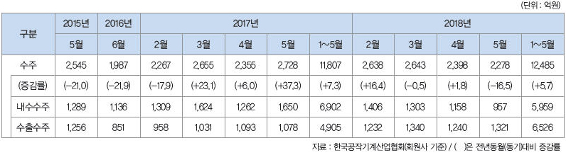 2018년 5월 공작기계 수주는 전월대비 5.0% 감소한 2,278억원을 기록했다. 전년동월대비로도 16.5% 감소한 금액이다. 내수 수주는 957억원으로 전월대비 17.4%, 전년동월대비 42.0% 감소했다. 수출 수주은 1,321억원으로 전월대비 6.6% 증가했다. 전년동월과 대비해서는 22.6% 증가했다.