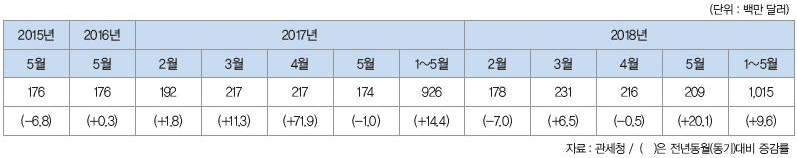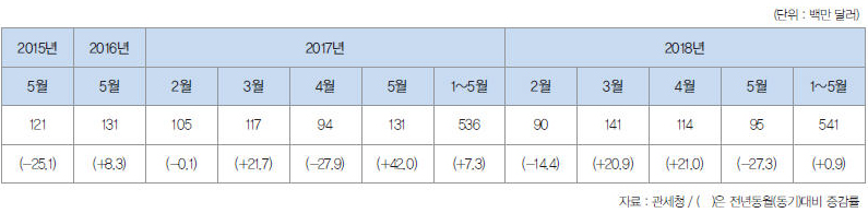 2018년 1~5월 지역별 수입에서는 유럽(1억7,600만 달러, +7.4%)이 전년대비 증가했으나, 아시아(3억3,800만 달러, -2.4%)와 북미(1,800만 달러, -27.4%)지역은 감소했다.