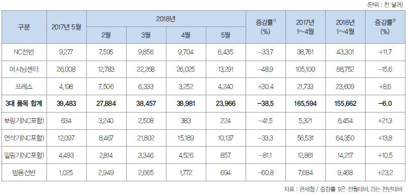 2018년 5월 공작기계 수출은 2억1,000만 달러로 전월대비 3.2% 감소했다. 전년동월과 비교해서는 20.1% 증가했다. 1~5월 수출은 10억1,500만 달러로 전년동기대비 9.6% 증가했다.