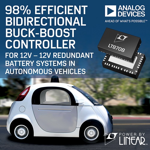 아나로그디바이스(ADI)는 자율주행차의 리던던트 배터리용으로 최적화된, 동일한 전압을 갖는 2개의 배터리 사이에서 동작하는 98% 효율의 양방향 벅-부스트 스위칭 레귤레이터 컨트롤러 신제품 파워바이리니어 LT8708과 LT8708-1을 출시한다고 밝혔다.