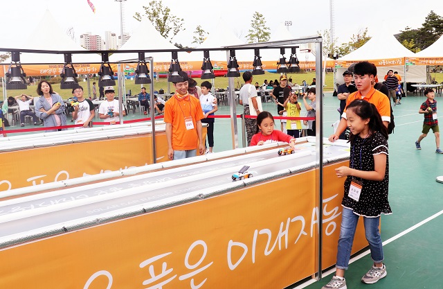 모형 태양광 자동차 경주대회에서 아이들이 직접 만든 자동차로 경주를 벌이고 있다. <사진 : 김동원 기자>