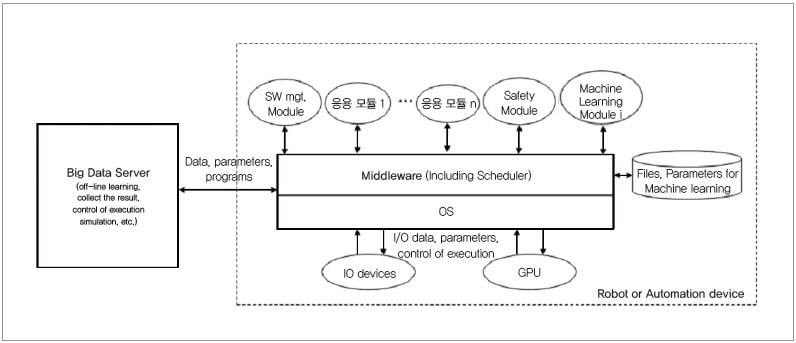 미들웨어는 이러한 소프트웨어 모듈들의 동작을 원하는 기능에 따라 제어하고 조립한 제품이 변경될 경우에는 서버(빅데이터 서버)로부터 필요한 소프트웨어와 기계 학습에 필요한 매개변수들을 모두 다운로드받아 설정한 후 동작을 시작시키고 필요시 정지시킨다. 또한, 미들웨어는 미들웨어에서 동작하는 소프트웨어 모듈들과 기계 학습에 활용되는 매개변수들을 저장하여 활용할 수 있다.