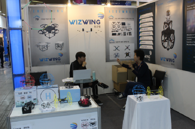 이번 전시회에서 위즈윙은 큐브70, 바퀴달린 미니 레이싱드론, 교육용 축구공 드론을 선보였다. 큐브70은 교육용 조립식·접이식 자력상승형 덕트 시스템을 갖췄으며, 수동모드 및 자동모드(자동이착륙 및 자동호버링 기능)를 지원한다. 또한, 드론에서 RC 자동차, RC 비행기로 변신할 수 있는 모드 변경 기능까지 갖춘 제품이다.