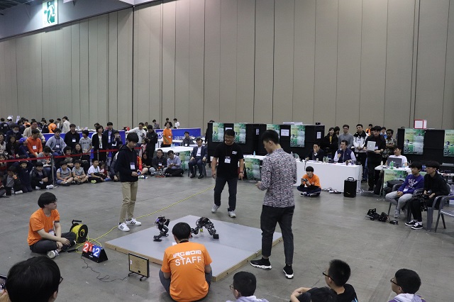 경기는 격투였다. 우리가 잘 알고 있는 UFC를 로봇들이 하고 있었다. 로봇은 서로에게 주먹을 날리기도 하고 붙잡아 넘어뜨리기도 했다. 심판은 로봇이 넘어질 때마다 카운트를 셌고, 로봇은 카운트가 다 세기 전에 스스로 일어섰다. 관건은 배터리였다. 배터리를 적게 소모하면서 적 로봇을 무찌르는 전략이 필요했다. 경기를 지켜보던 한 초등학생은 “만화에서만 보던 로봇들이 싸우는 모습을 보니 신기하다”며 “로봇들이 일어서고 격투하는 모습이 재밌다”고 말했다.