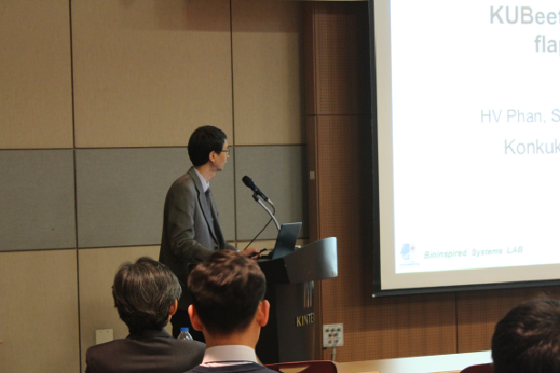 건국대학교 및 생체모방로봇 특화연구센터에 소속된 박훈철 교수가 ‘2018 로보월드’ 기간 중 열린 ‘국제로봇컨퍼런스(KRC 2018)’에서 ‘KUBeetle-Insect-Like Tailless Flapping-Wing Robot’라는 주제로 발표를 진행했다.