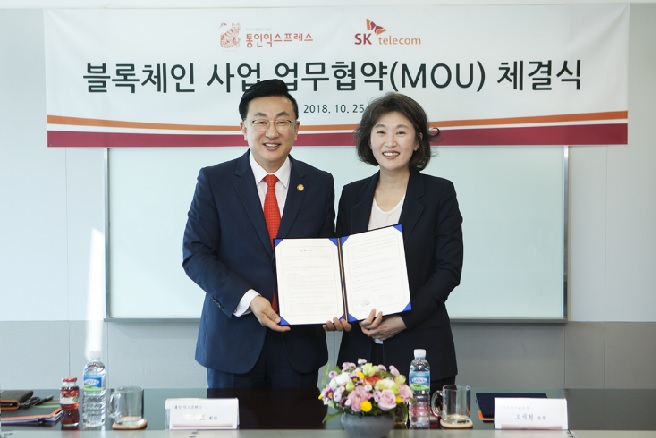 SK텔레콤은 포장이사 전문업체 통인익스프레스와 블록체인 기반의 이주 관련 O2O 플랫폼을 구현하기 위한 업무협약을 25일 체결했다. 서울 SK텔레콤 본사에서 열린 업무협약식에는 SK텔레콤의 오세현 블록체인사업개발 Unit장과 통인익스프레스의 이호 대표회장 및 관계자들이 참석했다.
