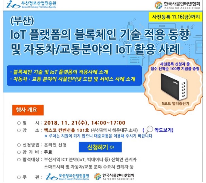 부산정보산업진흥원과 한국사물인터넷협회가 오는 21일 부산 벡스코 컨벤션홀에서 IoT 플랫폼의 블록체인 기술 적용 동향 및 자동차/교통분야의 IoT 활용 사례 세미나를 개최한다.