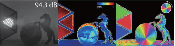 ▲ 이 카메라는 빛의 강도(왼쪽), 편광 이미지(가운데와 오른쪽)를 얻을 수 있다. 사진은 LED, 말 모형, 원뿔 모형이다.
