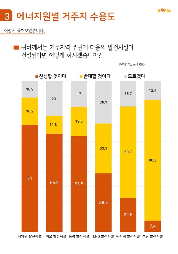 거주지 주변에 발전 시설에 건설될 경우 어떤 에너지를 선호하는지에 대한 질문에서는 태양광과 원자력의 격차가 더욱 벌어졌다. 거주지 주변 발전 시설이 건설될 경우 찬성 여부는 태양광이 71.0%로 가장 많았다. 찬성한다는 응답은 바이오(65.2%), 풍력(63.5%), LNG(38.8%), 원자력(22.6%), 석탄(7.4%) 순이었다.