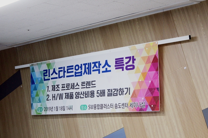 지난 1월 18일, 인천 글로벌캠퍼스에 위치한 인천 린스타트업제작소는 ‘혁신적인 제조를 위한 린스타트업제작소 특강’을 열었다. 글로벌캠퍼스 내 SW융합클러스터 송도센터 세미나실에서 열린 이번 특강은 앞으로 매월 각각의 주제를 갖고 진행될 예정이다.