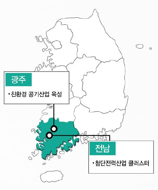 광주·전남은 전반적인 지역산업 부진과 전자 등 주력산업의 해외이전으로 어려움을 겪고 있어, 한전의 에너지밸리와 친환경 가전 수요를 기회로 첨단전력산업, 공기(空氣) 산업 등 대체 신산업을 육성한다. 광주‧나주는 차세대 전력산업 메카로 육성하고, 광주는 에어가전 거점화가 추진된다.