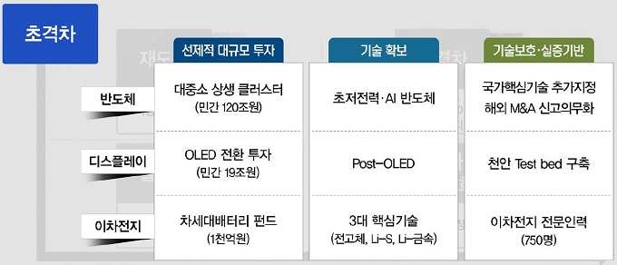 반도체·디스플레이·배터리: 후발국의 추격과 핵심 기술·인력 유출 우려가 현실화되고 있어, 적기에 대규모 투자와 차세대 기술선점을 지원하여 추월 불가능한 초격차 전략을 추진한다. 세부 내용을 보면 ▲ 10년간 120조원(민간투자)을 투자하여 대·중소 상생형 반도체 특화 클러스터 조성 ▲ Post-OLED, 차세대 반도체 등 미래선도 기술개발에 2조원 투자 ▲ 국가핵심기술 추가지정, 해외 M&A 신고 의무화로 기술유출 방지 등을 추진하게 된다.