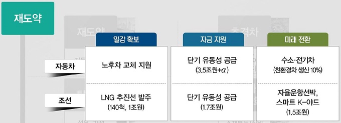 자동차·조선: 협력업체들의 당면한 위기극복과 함께 미래 트렌드인 친환경‧스마트화로의 산업생태계 개편을 가속화하여 재도약한다. 세부 내용으로 ▲ 자동차 중소·중견 협력사에 신규자금 및 만기연장 등에 3.5조원+ ɑ 지원 ▲ 노후차 교체 지원, 친환경차 생산비중의 대폭 확대(現 1.5% → ‘22년 10%) ▲ 자율운항선박, LNG추진선 개발 및 스마트 K-야드 조성(총 1.5조원) 등을 추진한다.