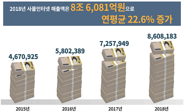 사물인터넷 매출액(8조6,082억원)은 2017년(7조2,579억원) 대비 18.6% 증가하였으며, 연평균(2015년~2018년) 22.6% 증가하였다.
