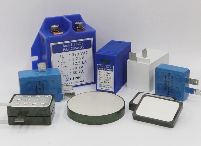 ▲ KERI와 (주)아이스펙이 개발한 대용량 바리스터(앞줄) 및 바리스터가 적용된 서지보호기 제품(뒷줄) <사진 : KERI>