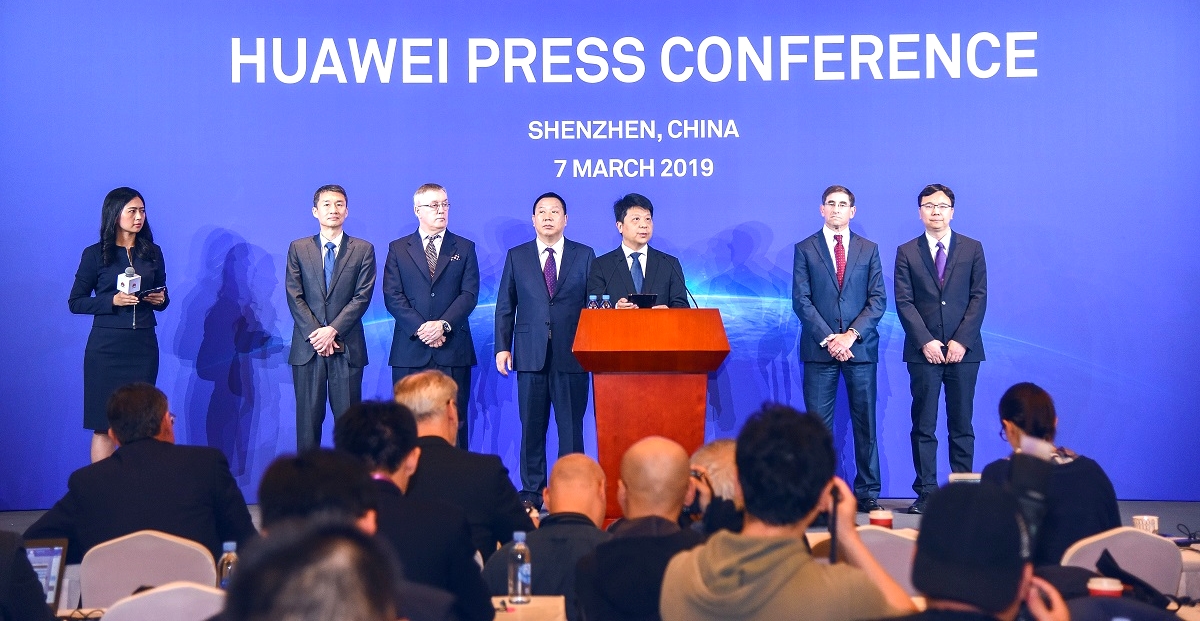 ▲ 궈 핑 화웨이 순환 회장(왼쪽 다섯 번째), 닥터 송 리우핑 수석 부사장 겸 최고 법률 책임(왼쪽 네 번째), 존 서포크 화웨이 글로벌 사이버 보안 겸 프라이버시 총괄 책임(왼쪽 세 번째), 글렌 디 네이거 존스데이社 화웨이 담당 대표 변호인(오른쪽 두 번째), 닥터 양 샤오빈 화웨이 5G 제품 라인 부문 사장(오른쪽 첫 번째), 리 다펑 감사회 임원 겸 ICT 인프라 관리 이사회 오피스 디렉터(왼쪽 두 번째)
