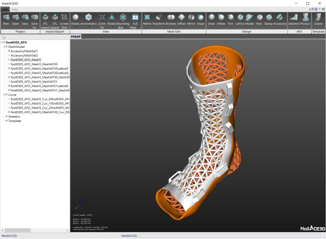 상지 보조기 설계 솔루션은 상지의 주요 4점을 기준으로 스켈레톤을 생성하고, 템플릿 디자인을 적용해 모델을 생성한 후 사용자에 의한 미세 편집이 가능하다. 하지 보조기 설계 솔루션은 환자의 스캔 데이터를 기반으로 발목 관절의 기준을 설정한 후 의사의 처방에 준한 자세 보정이 가능한 모델을 자동 생성한다. 메디에이스3D는 제공되는 템플릿 모델에 추가한 사용자 정의 템플릿을 구축해 활용하는 기능도 제공한다.