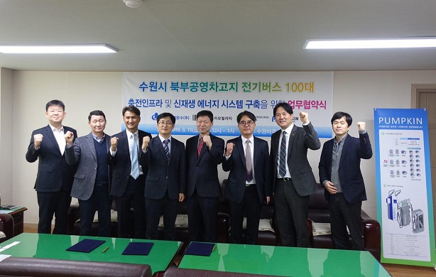 수원여객은 최근 수원시와 함께 친환경 전기버스 보급 활성화를 위한 업무 협약을 체결하며 미세먼지 저감을 위해 4월부터 전기버스 100대 도입을 준비하고 있다. 신성이엔지와 펌프킨은 이곳에 총 166kW의 태양광 발전소와 50대의 충전 스테이션을 도입한다.