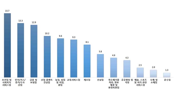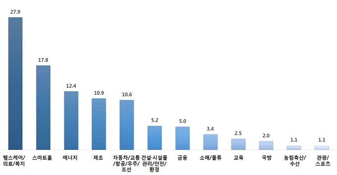 이와함께 사물인터넷 도입/확산 가능성이 높은 산업 분야로는 보건업 및 사회복지 서비스업이 15.7%로 가장 높게 나타났으며, 다음으로 전기/가스/증기/수도산업, 금융 및 보험업 등의 순으로 조사됐다.