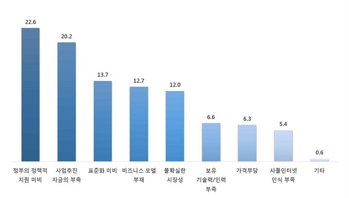 사물인터넷 사업을 영위하고 있는 사업체들은 사물인터넷 사업시 여러 애로사항을 겪고 있는 것으로 조사됐다. 사물인터넷 사업시 애로사항으로는 정부의 정책적 지원 미비가 22.6%로 가장 높게 조사됐다. 다음으로 사업추진 자금의 부족, 표준화 미비 등의 순으로 나타났다.
