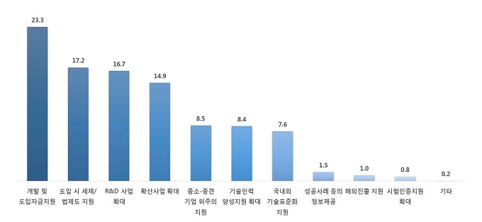 사물인터넷 사업 시 정부 요구사항으로 개발 및 도입자금지원이 23.3%로 가장 높게 조사되었으며, 다음으로 IoT 도입 시 세제/법제도 지원, R&D 사업 확대 등의 순으로 조사됐다.