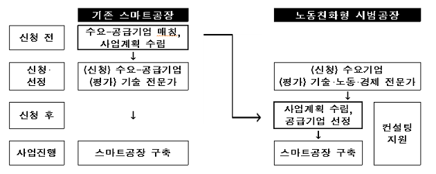 ▼기존 스마트공장과 노동친화형 시범공장 지원절차 비교
