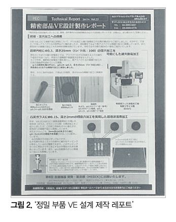 또한, 고객인 설계자를 위한 ‘정밀부품 VE 설계 제작 레포트’(그림 2)를 매월 발행, 부품 설계 시에 기계가공의 시선에서 가치를 높이면서 코스트를 내리는 힌트가 되는 정보를 발신 중이다(동사 HP에서 등록 가능).