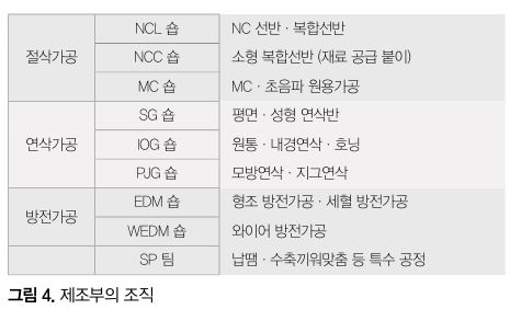본래 기계가공은 한 명이 착수에서 완성까지 다루는 것이 이상적이지만, 하나의 공정을 기능적으로 최고로 하기 위해 필요한 기간이 연 단위가 되기 때문에 100명 정도의 인원이 일하는 동사에서는 창업 당초부터 효율을 생각해 이 분업 형태로 생산하고 있다. 현재 9팀이 있으며, 동사에서는 독일의 제조현장을 모방해 팀을 ‘숍’이라고 부른다(그림 4).