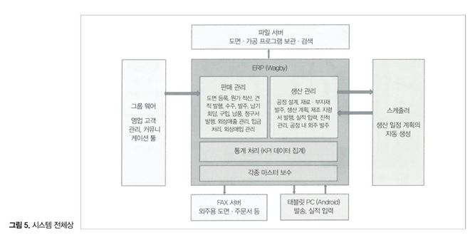 당초의 연계시키는 구상은 가공기계나 가공자의 여러 조건을 ERP에서 마스터로서 작성․보존, 스케줄러로 그것을 도입, 일정 계획을 시뮬레이션시키고 그 결과를 업무 시스템으로 되돌려서 운용하는 방법으로 했다. 또한 견적․수발주․판매 관리 기능은 이전의 AS/400 시스템의 기능이 충실하게 되어 있었으므로 소스 해석 위에 스크래치해 신 시스템에 이식․개선함으로써 개발 볼륨 저감을 도모했다.