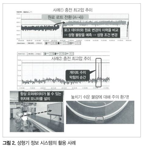 이 시스템은 성형기의 상태를 그래프화(가시화)해 과거로 거슬러올라가 그것을 볼 수 있는 것이 특징으로, 사내 네트워크 상이라면 공장 내외에 관계없이 공장 전체의 성형기 상태를 웹 브라우저 상으로 확인할 수 있다. 동사에서는 이 시스템을 오퍼레이터가 유효 활용할 수 있게 성형기 옆이나 성형 공장 내 통로에 모니터를 설치해 임의의 그래프를 표시하고 있다. 그 활용 사례를 시스템의 그래프와 함께 그림 2에 나타냈다.