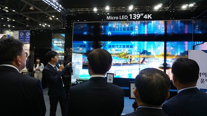 루멘스가 일산 킨텍스 제1전시장에서 개최 중인 광유합엑스포 2019에서 ‘Leading the LED Revolution (LED 혁명 선도)’를 주제로 마이크로 LED 139인치 4K를 소개했다. 또한 초박형의 마이크로 LED 모듈(T0.5mm)도 볼 수 있다.