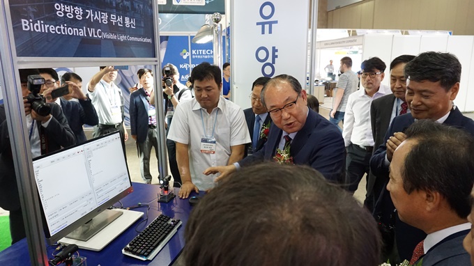▲ 유양디앤유 김상옥 대표가 전시회에 참석한 VIP들에게 양방향 가시광 무선통신기술(Bidirectional VLC)에 대해 설명하고 있다.