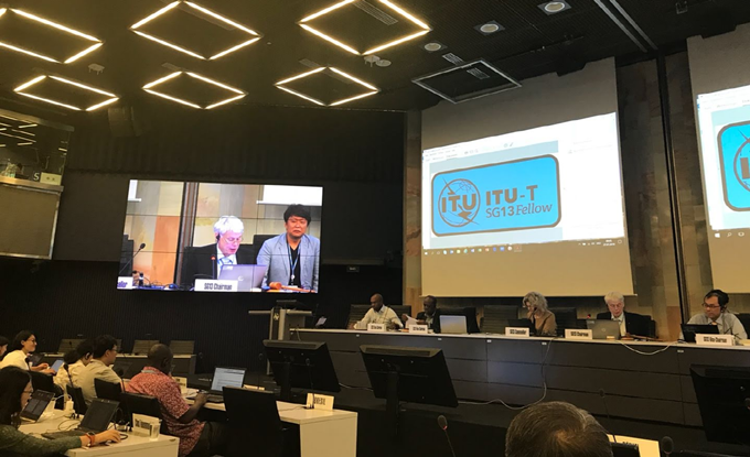 ▲ 2018년 10월 제네바에서 개최된 ITU-T SG13회의에서 ETRI 표준연구본부 이강찬 책임연구원이 Fellow 상을 수상하는 모습