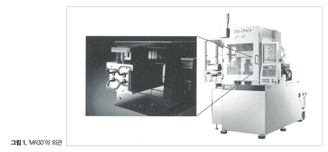 MR30은 OPM 금형을 탑재한 eV-LINE 사출성형 유닛을 베이스로 해서 사출성형에 필요한 주변기기를 올인원 구조로 한 OPM 금형 전용 생산 셀 시스템으로, 표준 장비하는 베이스형에 카세트 방식의 OPM 금형을 삽입해 성형을 한다(그림 1).