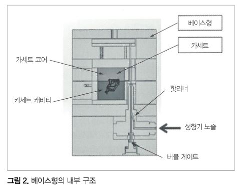 MR30은 이 카세트를 베이스형에 내장된 클램퍼로 고정/해방, 카세트 내의 통수/물빼기를 제어함으로써 카세트의 교환 전후의 작업을 자동으로 하는 것을 가능하고 있다. 또한 베이스형에는 버블 게이트식 핫러너를 내장, 재료 수율 향상과 하이사이클 성형 대응도 가능하게 하고 있다(그림 2).