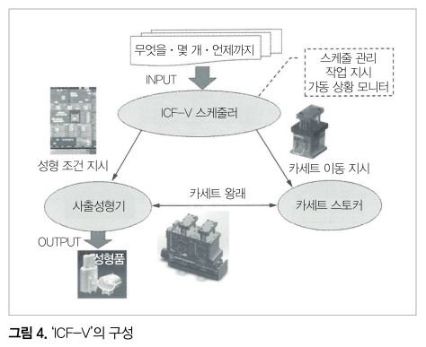 ICF-V는 ‘무엇을’(제품)․‘몇 개’(생산 예전 수)․‘언제까지’(희망 납기) 등의 정보로부터 생산 계획의 스케줄링을 해 그 생산 계획을 따라 제품을 성형하는 카세트를 반송, 그 제품을 위한 조건으로 지정된 수량을 생산한다(그림 4).