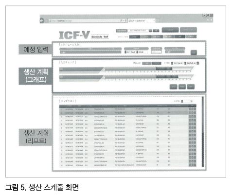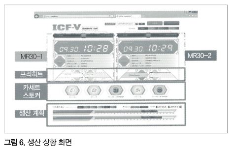 생산 계획의 입력이나 생산 계획의 참조․변경을 하는 생산 스케줄 화면(그림 5), MR30으로 생산 중의 제품이나 카세트 스토커로 대기 상태의 카세트 번호 등을 참조하는 생산 상황 화면(그림 6)이 있다.