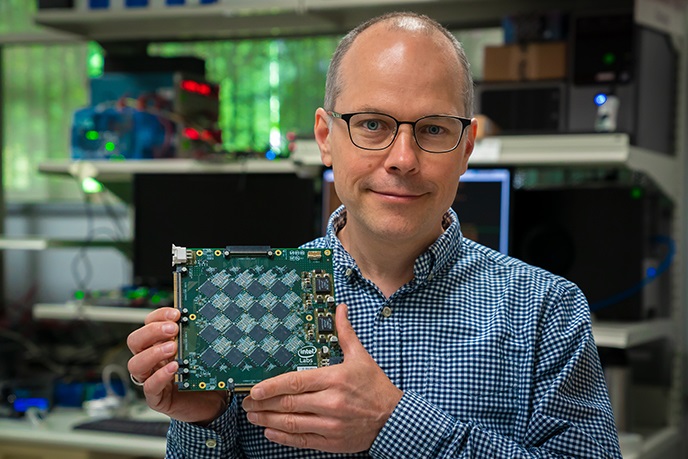 ▲ 인텔 랩 매니징 디렉터 리치 울리가 8개에서 32개 인텔 로이히 뉴로모픽 칩으로 구성되는 인텔 나후쿠 보드를 들고 있다.