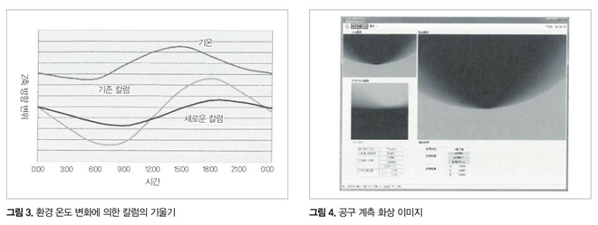 이번에 환경 온도 변화가 더 급격한 경우에도 칼럼의 기울기를 억제하는 TR 칼럼을 개발했다. TR 칼럼은 좌우 칼럼 내부에 유체를 투입, 칼럼의 열용량을 대폭으로 증대시키고, 또한 칼럼 전후의 온도차를 경감함으로써 칼럼의 기울기 변화를 억제한다. TR 칼럼 채용에 의해 기존기에 비해 기계 정도 변화를 1/3 이하로 경감할 수 있다(그림 3).