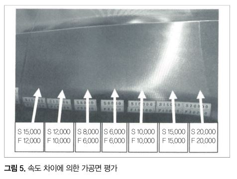 그림 5에 나타냈듯이 동사 테스트 금형에서 가공 속도가 다른 부위 간(이음매부)에 단차가 없는 가공면을 얻을 수 있으며, DCS가 우수한 제어성을 실증하고 있다. 또한 워크 중량 선택 기능을 기존과 비교해 보다 세분화하고, 워크 중량에 맞춘 최적의 중량 모드 설정을 가능하게 했다. 또한 워크 중량 자동 측정 기능(옵션)을 개발, 중량 모드 선택을 자동화하는 기능도 추가했다.