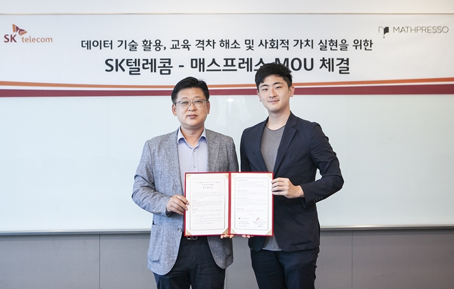 SK텔레콤이 교육 플랫폼 기업 매스프레소(Mathpresso)와 우리 사회의 교육 격차를 해소하고 사회적 가치를 실현하기 위한 협력에 나선다. SK텔레콤은 매스프레소와 ‘데이터 기술 활용, 교육 격차 해소 및 사회적 가치 실현을 위한 업무협약(MOU)’을 체결했다고 17일 밝혔다.
