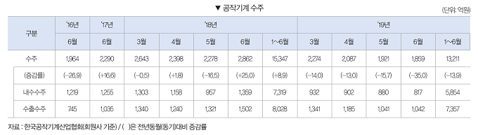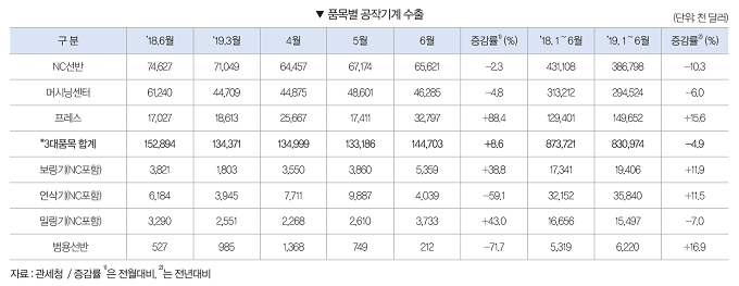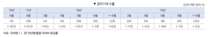 2019년 6월 공작기계 수출은 2억200만 달러로 전월대비 3.6% 증가했다. 전년동월과 비교해서는 7.9% 감소했다. 2019년 1∼6월 공작기계 수출은 12억400만 달러로 전년동기대비 2.5% 감소했다.