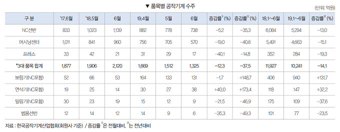 2019년 6월 품목별 수주를 보면, NC절삭기계는 전월대비 3.3% 감소한 1,790억원을 기록했다. 성형기계도 전월대비 21.6% 감소한 27억원을 기록했다. 반면 범용절삭기계는 전월대비 20.5% 증가한 41억원을 기록했다.