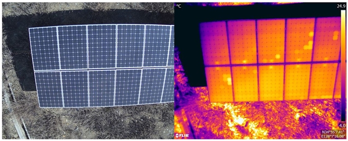 ▲ FLIR Duo™ Pro R 열화상 카메라를 활용하면 태양광 패널 표면의 오염이나 특정 부위의 과열, 그 밖의 다양한 결함 내용과 결함의 위치를 신속히 파악할 수 있다. 사진은 FLIR Duo™ Pro R로 촬영한 삼천포 태양광발전 시설의 실화상(왼쪽)과 열화상.