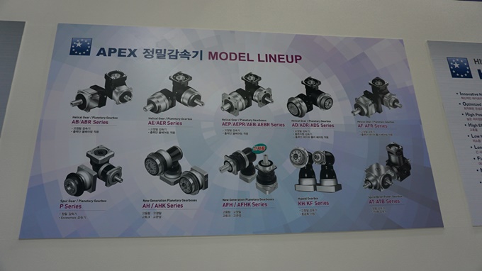 아펙스 다이나믹스 코리아(Apex Dynamics Korea)가 2019 한국기계산업전에서 기어박스(GearBox) AT 시리즈, ATB 시리즈, K시리즈 등과 정밀 감소기 AB/ABR 시리즈, AE/AER 시리즈 등 다양한 제품라인업을 선보였다.