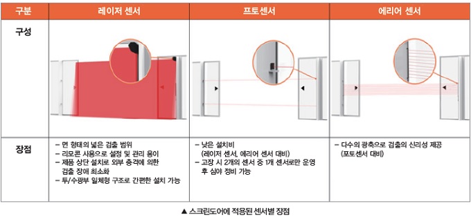 스크린도어가 정상적으로 개폐되기 위해서는 가장 먼저 센서가 검출 범위 내의 물체를 감지해야 한다. 기존 스크린도어에 사용되고 있는 센서들의 대부분은 1세대 포토센서나 2세대 에리어센서(다수의 광원을 사용하여 특정 영역을 검출하는 센서)였다. 하지만 안전과 직결되는 만큼 보다 정확하고 민감하게 물체를 감지할 수 있는 센서가 필요했다. 그래서 적용된 것이 바로 레이저 스캐너이다.