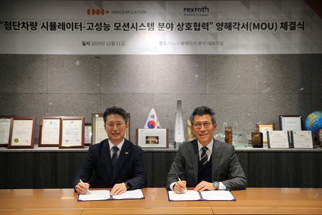 보쉬렉스로스코리아(대표이사 김신)와 이노시뮬레이션(대표이사 조준희)이 지난 11일, 이노시뮬레이션 본사에서 자율주행 자동차 모션 시뮬레이터 사업에서의 경쟁력을 강화하기 위한 전략적 업무협약(MOU)을 체결했다.